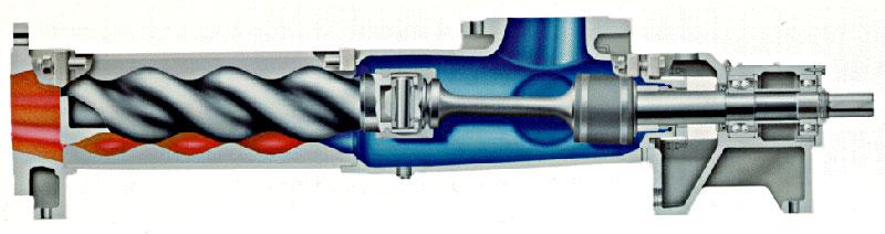 首先,該螺桿泵是一種內(nèi)嚙合回轉(zhuǎn)式容積泵,當單線螺旋的轉(zhuǎn)子在雙線的螺旋的定子孔內(nèi)繞定子軸線作行星回轉(zhuǎn)時,轉(zhuǎn)子一一定子付之間形成的密閉腔就連續(xù)的、勻速的、容積不變的將介質(zhì)從吸入端輸送到輸出端。